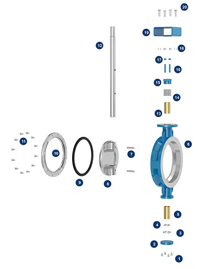 2、防靜電:由于閥座采用聚四氟乙烯等非金屬材料,致使蝶板與閥座在啟閉過(guò)程中會(huì)產(chǎn)生靜電,靜電積累會(huì)產(chǎn)生安全隱患,在結(jié)構(gòu)上采用限位套結(jié)構(gòu)將蝶板上的靜電通過(guò)限位套傳遞到閥體上,同時(shí)在閥體上設(shè)置防靜電螺栓與地面接觸,從而達(dá)到消除靜電積累的目的。